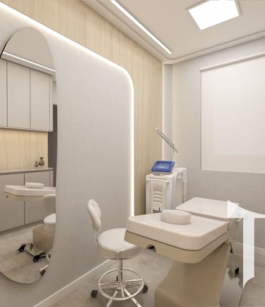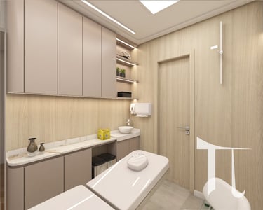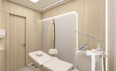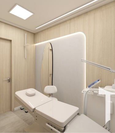 Desenhamos as salas de atendimento com foco na ergonomia da maca e no posicionamento exato de equipamentos de laser, garantindo espaço de manobra técnico e conforto psicológico para o paciente durante tratamentos de alta complexidade.
