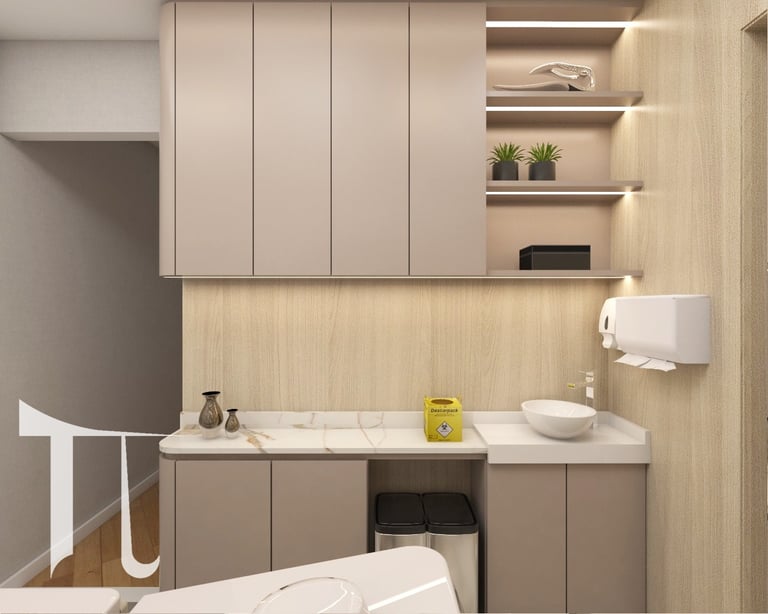 Criamos bancadas de apoio em materiais não-porosos (exigência da Anvisa) para procedimentos assépticos. A bancada é estrategicamente posicionada para que o médico tenha acesso rápido aos materiais sem contaminação, com pia em mármore para assepsia perfeita das mãos.