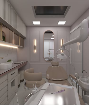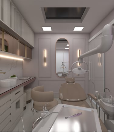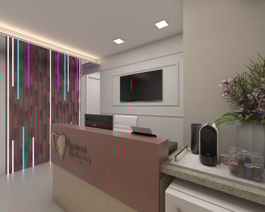 A primeira impressão do paciente particular é construída na recepção, onde desenhamos uma atmosfera de luxo acolhedor. O balcão em tons de marsala (cor obrigatória da marca Dra. Grazielle Rodrigues, mas equilibrada com texturas de madeira e ouro) chancelam a exclusividade da clínica. Integramos princípios de neuroarquitetura com iluminação indireta e uma estação de café premium para reduzir a ansiedade fóbica comum aos tratamentos dentários, transformando a espera em uma experiência de spa urbano.