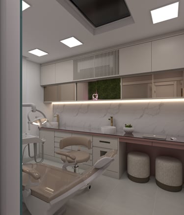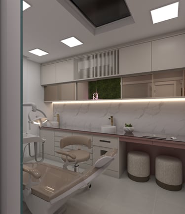 No ambiente clínico, a imponente parede de mármore com veios marcantes e a marcenaria flutuante com acabamentos em ouro e iluminação integrada criam um cenário perfeito para fotos e vídeos que chancelam a autoridade da dentista. A cadeira de couro taupe e os equipamentos de última geração transmitem precisão tecnológica, enquanto a parede de musgo preservado com o neon 'tooth' traz o elemento biofílico e a assepsia exigida pela RDC 50, sem comprometer a beleza.