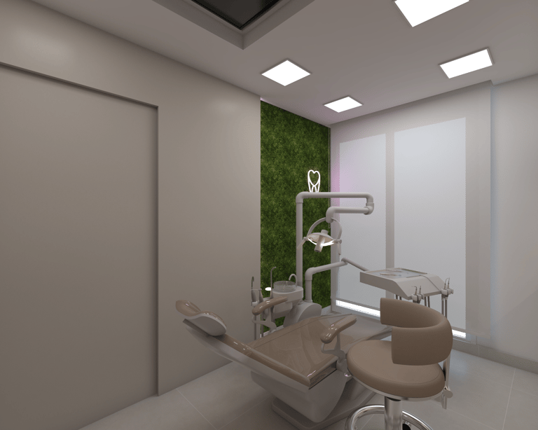 O musgo preservado na parede de fundo é um material biofílico, mas não-poroso e de fácil higienização (Anvisa RDC 50), que traz a natureza para o ambiente estéril. A iluminação em painéis de LED sobre a cadeira fornece luz de alta fidelidade cromática para procedimentos estéticos (como facetas), enquanto o neon e o layout limpo garantem que cada canto da clínica seja esteticamente agradável e funcional, blindando o espaço contra problemas normativos.