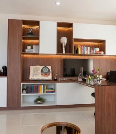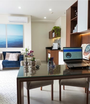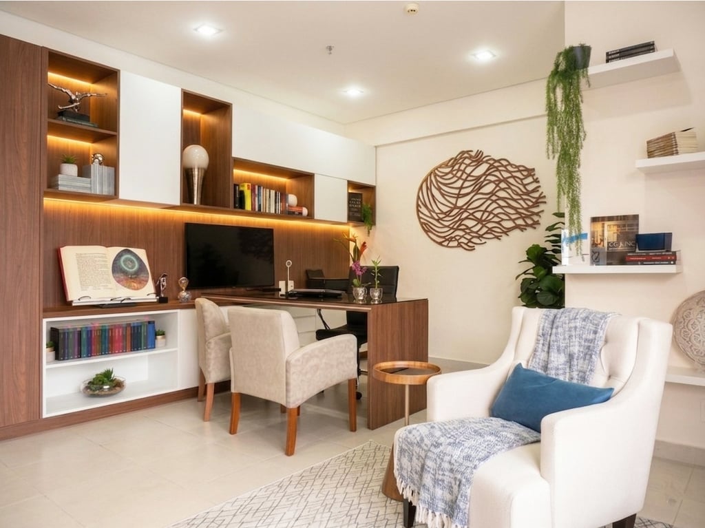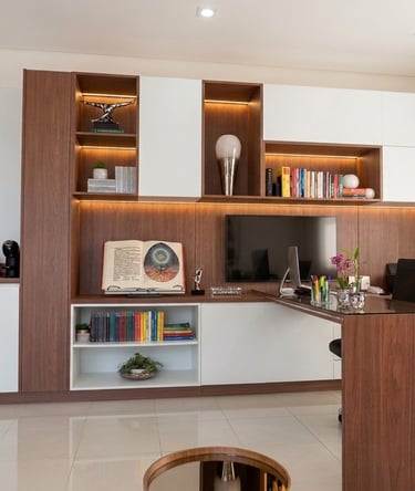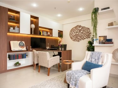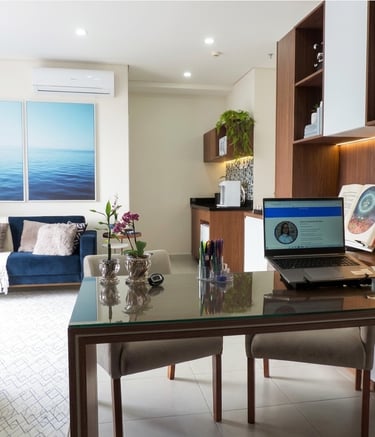 No consultório, a prioridade foi o conforto acústico e visual. Substituímos o layout tradicional por uma disposição que favorece o contato visual sem pressões, utilizando poltronas de alta ergonomia e uma iluminação indireta que não ofusca. Cada elemento, da escolha dos tecidos à temperatura da luz, foi planejado para reduzir os níveis de cortisol (estresse) e facilitar a abertura emocional necessária para o sucesso da terapia em temas tão sensíveis.