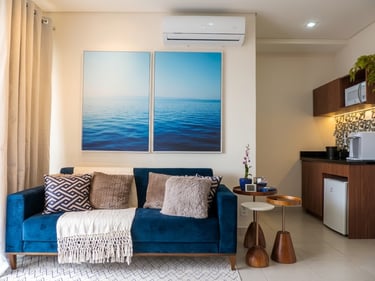 O ponto central desta sala é a composição entre o sofá em veludo azul e a obra de arte ao fundo. Na psicologia das cores, o azul atua como um estabilizador emocional, transmitindo paz, lealdade e segurança — sentimentos cruciais para quem busca apoio em questões de sexualidade.
